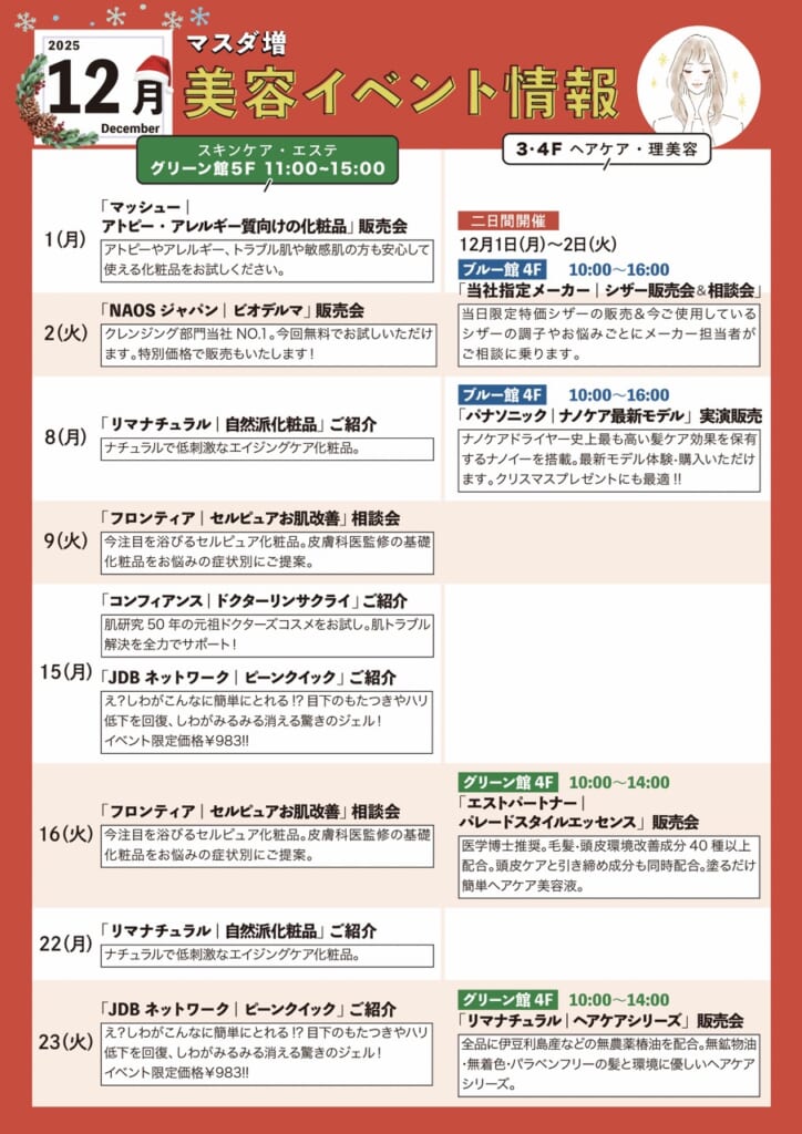 12月に行われる、美容商品のデモンストレーション販売会(デモ販売会)や体験会のスケジュールです。